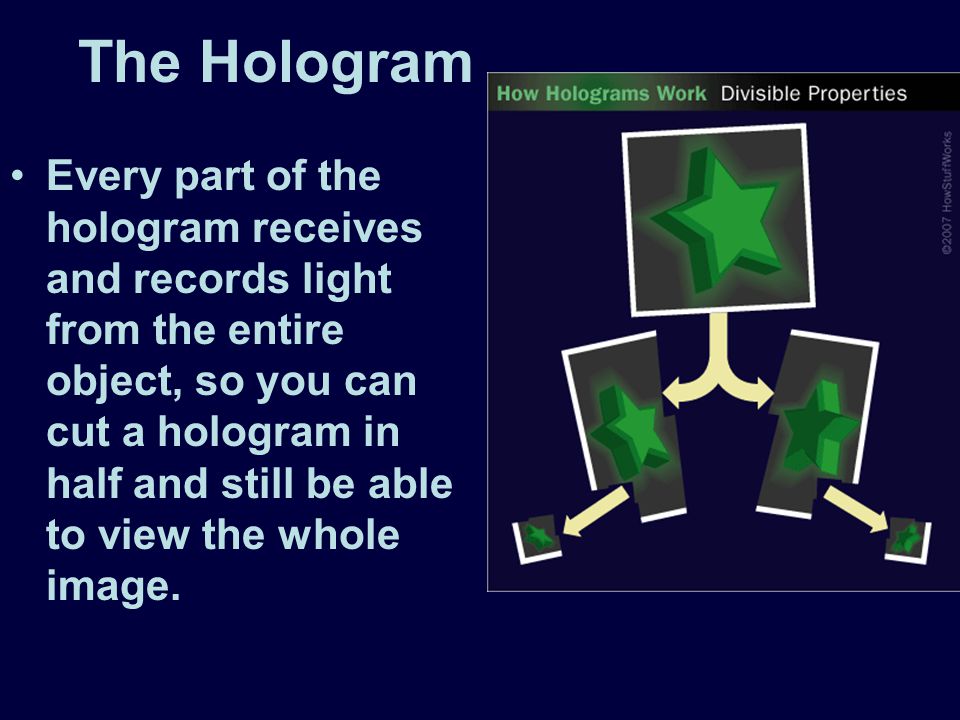 If a hologram is cut into pieces, each piece projects the entire image,